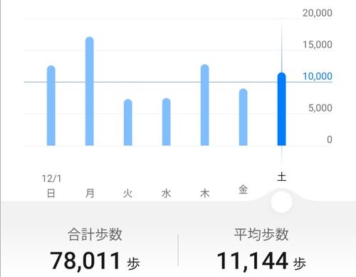1週間の歩数 今週は東京への出張の他、新幹線に忘れた帽子や無くしたポイントカードを受け取りに行って、よく歩いた。1週間の平均歩数1万1,144歩。また歩きすぎてしまった。 一方で、こうなっていることは分かっていたので体重計に乗るのが怖かったのだが……